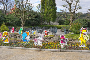 フラワーガーデンが、らいおんくんとハローキティ、うさぎちゃんとマイメロディなど、コラボレーションならではのキャラクターたちが並んだデザインです。