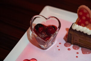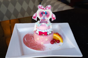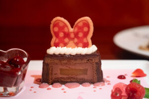サワーチェリームースケーキにチーズのムースが乗った、2段ケーキのような華やかなデザート。トップにはハートに囲まれたミニーがいます。