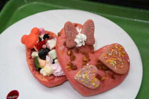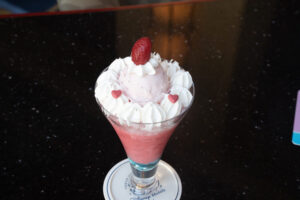 トッピングにはストロベリーアイスやハート型のチョコをのせ、パフェのような豪華な見た目に。ミニーのポップでキュートな世界感を表現しています。