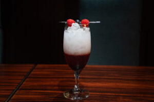 水色とピンクでミニーのコスチュームをイメージしたドリンク。ヨーグルトドリンク、ヘーゼルナッツシロップを使用し、ヨーグルトの甘酸っぱさとヘーゼルナッツの香ばしさを感じさせます。