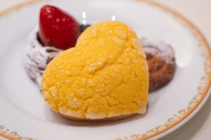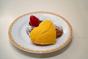 ムースケーキはスポンジに包まれ、ポルカドットのデザインに。