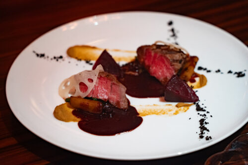黒毛和牛のフィレ肉に、カシスのソースの酸味やアンチョヴィの塩味が加わり、上品で奥深い味わいです。