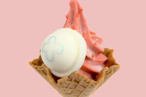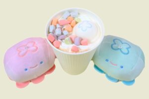 ふわふわクラゲのいちご練乳サンデー(850円)は、いちご味のソフトクリームに練乳と甘酸っぱいいちごクランチ、そしてふわふわもちもちのミズクラゲ型マシュマロをトッピングしたサンデーです。
