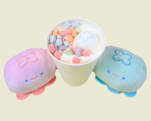 ゆらめくクラゲバニララテ‌(800円)は、バニラシロップ入りのカフェラテにホイップクリームとカリッとした食感の乾燥マシュマロ、そしてふわふわもちもちのミズクラゲ型のマシュマロをトッピングした甘いホットドリンクです。アルコール版(900円)も登場します。‌