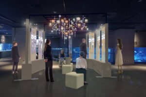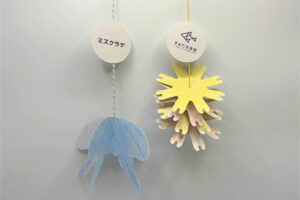 クラゲをモチーフにしたクラゲランプが展示スペースの天井を彩ります。