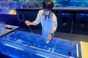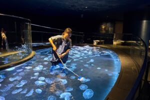 クラゲエリアでは、常時約14種700匹のクラゲを展示しています。展示しているクラゲは全て館内のラボで生まれており、さまざまな種類のクラゲやその成長過程を観察できます。‌