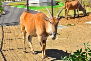 エランドは、ウシ科の大型草食動物。レイヨウ類の中で最も大きな種で、アフリカのサバンナを中心に生息しています。園内では、アフリカの大自然に集うキリンやシロオリックスなどの動物たちを間近に観察できるエリアとして「サバンナエリア」を設けており、その一角にエランドの親子3頭が暮らしています。