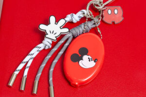 ミッキー、ミニー、チップ&デール、プルートのイニシャルロゴのパッチが付いたミニポーチチャーム。