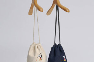 「10th Anniversary」ロゴをサガラ刺繍であしらった巾着バッグ。
