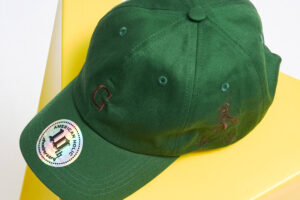 ミッキー、ミニー、ドナルドグーフィーのイニシャルをそれぞれ刺繍したキャップ。