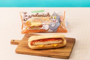 ジェリーの大好物であるチーズとポークカツレツ、ラタトゥイユを挟んだごちそうサンド「トムとジェリー パニーニ風カツサンド ~チーズ&ラタトゥイユ~」(495円)は、温めて食べるのもおすすめの商品。