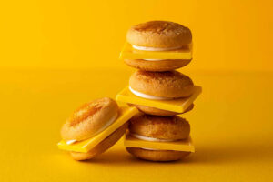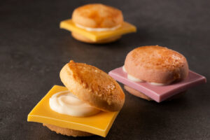 しっとり食感のダブルいちごバーガー。苺を練り込んだ“いちごミルク味のはみ出しチョコレート”に、甘酸っぱい“いちごのホイップショコラ”をぷっくり絞りました。いちごと発酵バターが香るソフトクッキーでサンドして、まんまるカービィのフェイスを描いたら、しっとり食感“カービィのスイーツバーガー”のできあがり。
