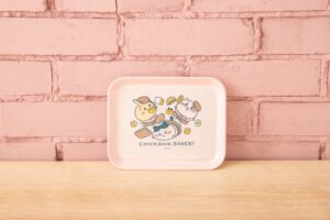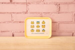 パン屋さんの衣装の、ちいかわ、ハチワレ、うさぎがデザインされたトレーやクッキー缶など日常の食事が楽しくなるようなアイテムを販売。