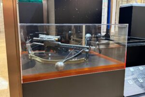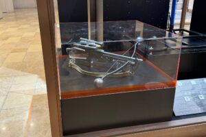 デイジー・リドリーが使用したアクション用ジャクー・クォータースタッフ、ファースト・オーダー ストームトルーパー ヘルメット、チューバッカのスタント用ボウキャスター、ハリソン・フォードが使用したアクション用DL-44ブラスターが並びます。