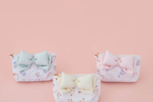 各キャラクターに合わせて、カラーリボンを添えた同素材のラウンドポーチ(4,700円)やタオルハンカチ(1,980円)も登場します。