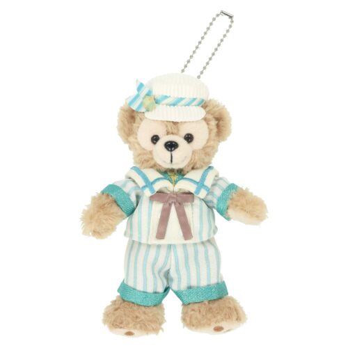 ストーリーに登場する “ファインド・ブルー号”に乗って今から出発するかのようなダッフィーのぬいぐるみやぬいぐるみバッジ販売します。