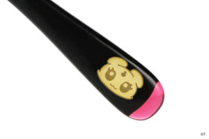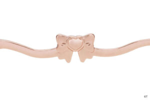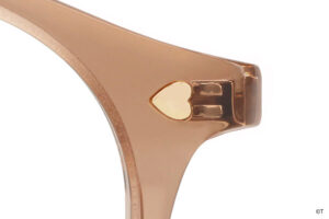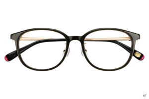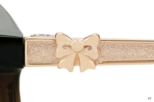 つるのカラーリングやサイドのリボンなど、キュアブラックの衣装をメガネに落とし込みました。カジュアルな雰囲気の中に、サイドのキラキラとした輝きがアクセントに。つる先には、こっそりメップルがかくれんぼ。