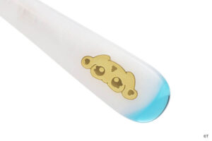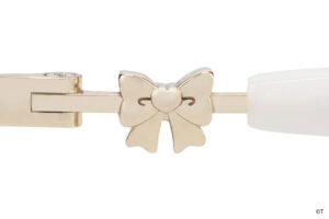 つるのカラーリングやサイドのリボンなど、キュアホワイトの衣装をメガネに落とし込みました。知的な印象を与える細めの玉型と、ホワイトカラーのつるが、上品さを演出。つる先には、こっそりミップルがかくれんぼ。