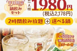 「鍋飲みセット」は、アルコール2時間飲み放題と選べる3種の鍋で1,980円(税込2,178円)というコストパフォーマンスの高さが特長で