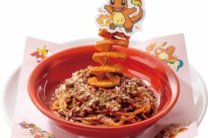 ヒトカゲの「ほのおのうず」を、トルネードポテトでダイナミックに表現しました。濃厚なミートソースパスタに、外はカリッと中はホクホクのポテトを絡めて食べる満足感たっぷりの一皿です。