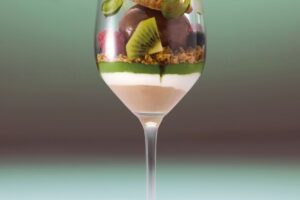 展覧会のイメージカラーであるグリーンを、抹茶マカロン・ピスタチオソースで表現し、濃厚なチョコレートアイスクリームとフルーツを合わせました。