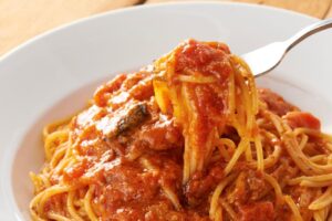 料理は、一番人気の「トマトとニンニクのスパゲティ」をはじめとするイタリア産のトマトやスパゲティを使った各種パスタメニューの他、店内で焼き上げるピッツァ、前菜やサラダ、デザートなど、バラエティ豊富に取り揃えています。