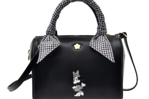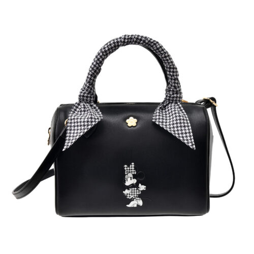 ボストンバッグ(7,900円)は、ショルダー付きの2WAY仕様。するんとなめらかなレザー調生地のバッグに、クラシカルな千鳥格子柄のアクセントをプラス。スカーフを巻いたようなハンドルや、内側に施したブランドシンボルであるデイジーモチーフの総柄など、細部までこだわった仕上がりです。