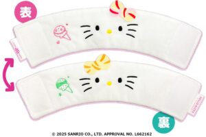 キティとミミィのリバーシブルスリーブもセット。表はキティ、裏はミミィが刺繍された起毛素材で、ドリンクカップやマイボトルに付けて楽しめます。