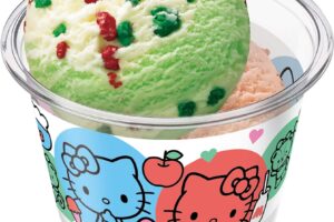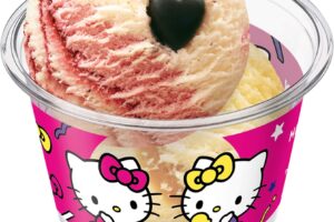 ハローキティ スペシャルダブルカップは、キティのカップデザインに好きなアイス2個が入っています。キティのアイスクリームチャームとアイシングビスケット付き。