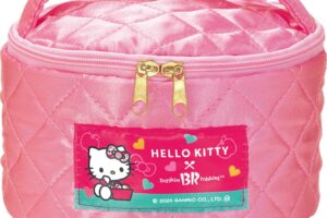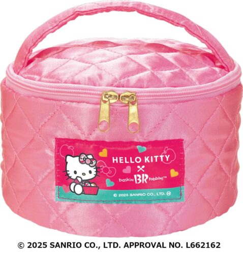 キティのバニティポーチ付き。キルティングのピンクサテン生地でできたポーチは、ラブポーションサーティワンデザインのキティがプリントされたオリジナルデザインで、コスメや小物の収納に使いやすいサイズです。