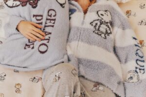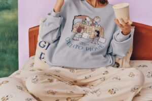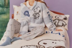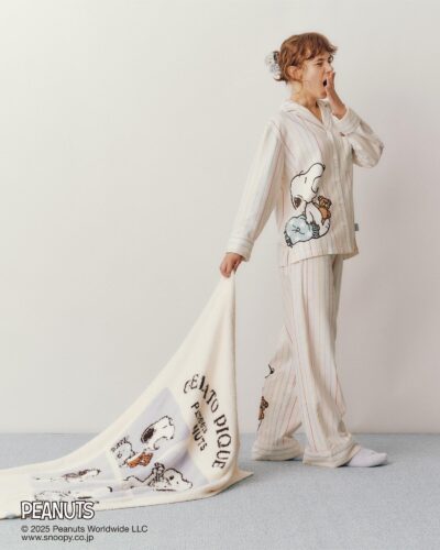 PEANUTSの仲間たちのおやすみ前のひとときを描いたニットシリーズは、ふんわりとした着心地と、ゆったりとしたシルエットでおうち時間を快適に過ごせます。