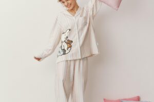 総柄カットソーには、枕で気持ちよさそうに寝ているスヌーピーや、アイスを食べているチャーリー・ブラウン、枕投げしているペパーミント パティなど、おやすみ前の時間を思い思いに過ごす仲間たちを描いています。
