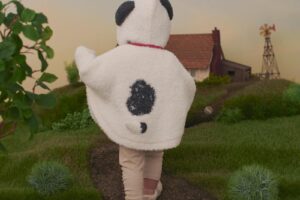 おうちの屋根のようなアーチロゴと、鏡や窓をイメージしたフレームを描いたワンポイントロンTには、今夜のルームウェアを選んだり、歯磨きをしたりするスヌーピーやブランドアイコンでもあるもこもこのボーダーパーカを着て遊んでいるペパーミント パティなどのオリジナルアートをデザイン。