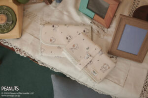 スヌーピーやサリー・ブラウン、ペパーミント・パティなどの仲間たちのおやすみ前の心温まるシーンが散りばめられた、オリジナルアートをあしらったアイテムがラインアップ。