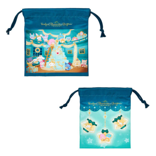 大サイズの巾着は、ツリーを飾りつけるキティたちとJOCHUMのメインアートや、キャラクターの集合デザイン。