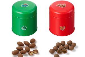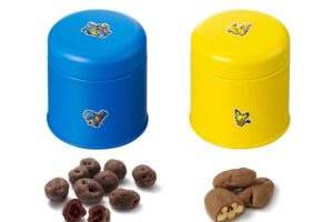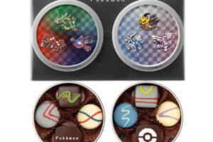 みずタイプのポケモン、ゼニガメとその進化形カメール、カメックス、でんきタイプのポケモン、ピチューの進化形、ピカチュウ、ライチュウを円柱缶にデザインし、クランベリーチョコレートとペカンナッツチョコレートを詰めました。