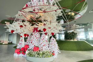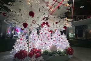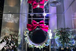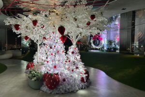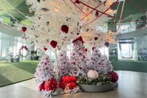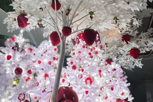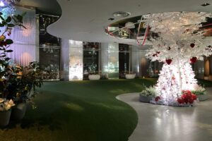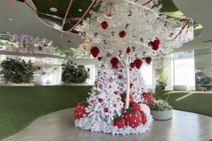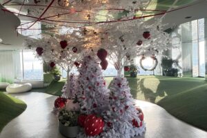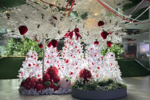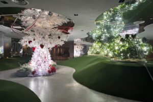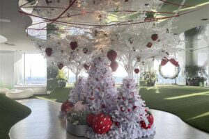 雪をイメージしたホワイトと冬の澄んだ空のスカイブルーを基調にした装飾で、いちごのリースやツリーをデコレーション。