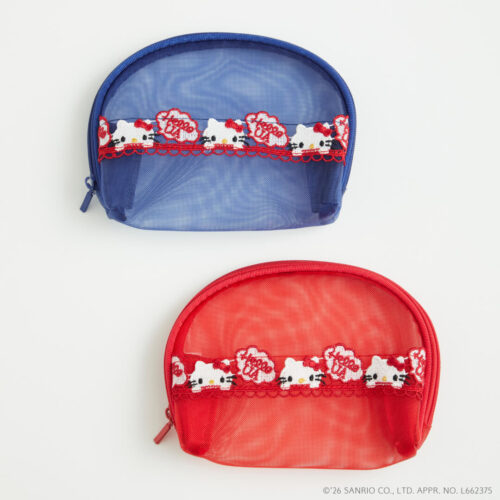 「近沢レース店」で定番のメッシュ小物シリーズより、懐かしい70年代をイメージしたハローキティを繊細なレースで表現したミニポーチ。小物類を持っておくのにぴったりなダブルファスナーの仕様で、2か所に分けて収納可能です。ビビッドな赤、青のメッシュと、かわいらしいハローキティの刺繍がアクセントになったアイテムです。