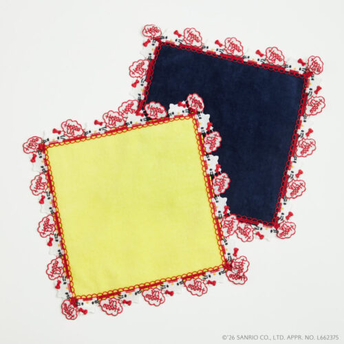 70年代をイメージしたハローキティを繊細なレースで表現した1枚。かわいいお顔を覗かせて「HELLO UA」とごあいさつしています。白、赤、黒の3色の刺繍に、タオル地は深みのある落ち着いたネイビー、元気が出るビビッドなイエローの2色展開。バッグに入れていつでも一緒にお出かけが楽しめるアイテムです。