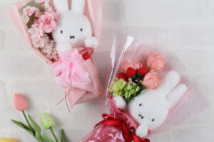 人気の「着せかえほわほわぬいぐるみ」とお手入れ不要のアートフラワーのブーケ(6,000円)。華やかで愛らしいミッフィーの姿を楽しめる本アイテムは、自分用にはもちろん、贈り物にもぴったりです。