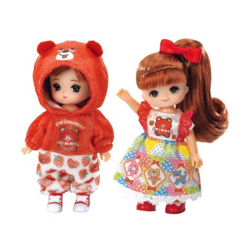 ミキちゃんはスイマーのキャラクター「スイクマちゃん」のフードが付いたパーカー、マキちゃんは「SWIMMERだいすきリカちゃん」とお揃いのデザインのワンピースコーデです。