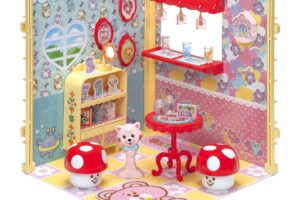 付属の家具や小物は「シャポードール(帽子たて)」「フラワーミラー」「壁掛け時計」「グラス」「キャニスター」など、実際のSWIMMERのグッズをリカちゃんサイズで再現しています。テーブルやシェルフ、アートフレームなど、お部屋の家具や壁紙にもSWIMMERのキャラクターやデザインがあしらわれています。