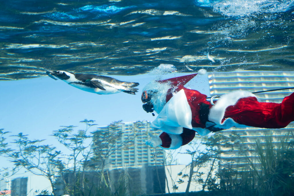水槽にサンタダイバーが登場 サンシャイン水族館のクリスマスイベント