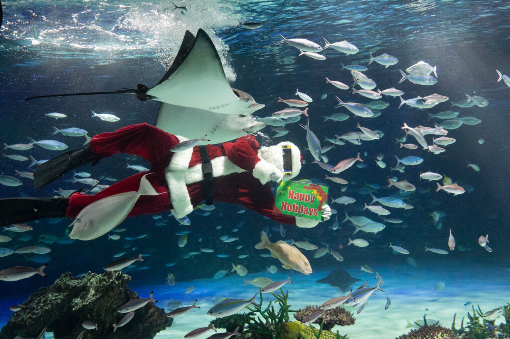 水槽にサンタダイバーが登場 サンシャイン水族館のクリスマスイベント