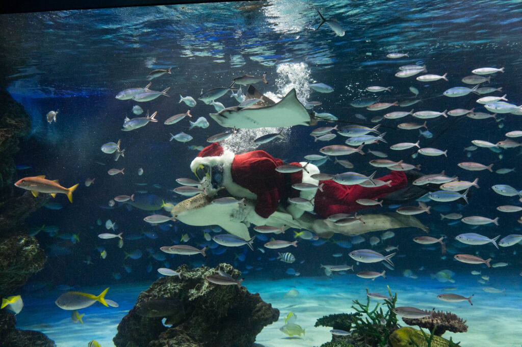 水槽にサンタダイバーが登場 サンシャイン水族館のクリスマスイベント