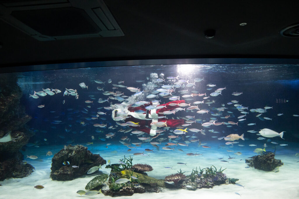 水槽にサンタダイバーが登場 サンシャイン水族館のクリスマスイベント